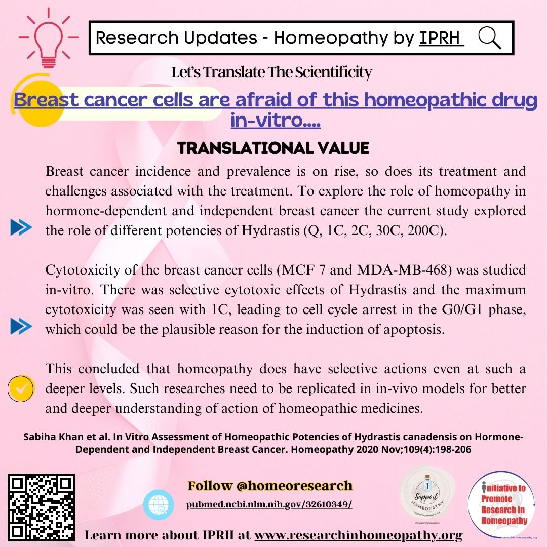 Original Study Ref: Sabiha Khan et al. In Vitro Assessment of Homeopathic Potencies of Hydrastis canadensis on Hormone-Dependent and Independent Breast Cancer. Homeopathy 2020 Nov;109(4):198-206. pubmed.ncbi.nlm.nih.gov/32610349/