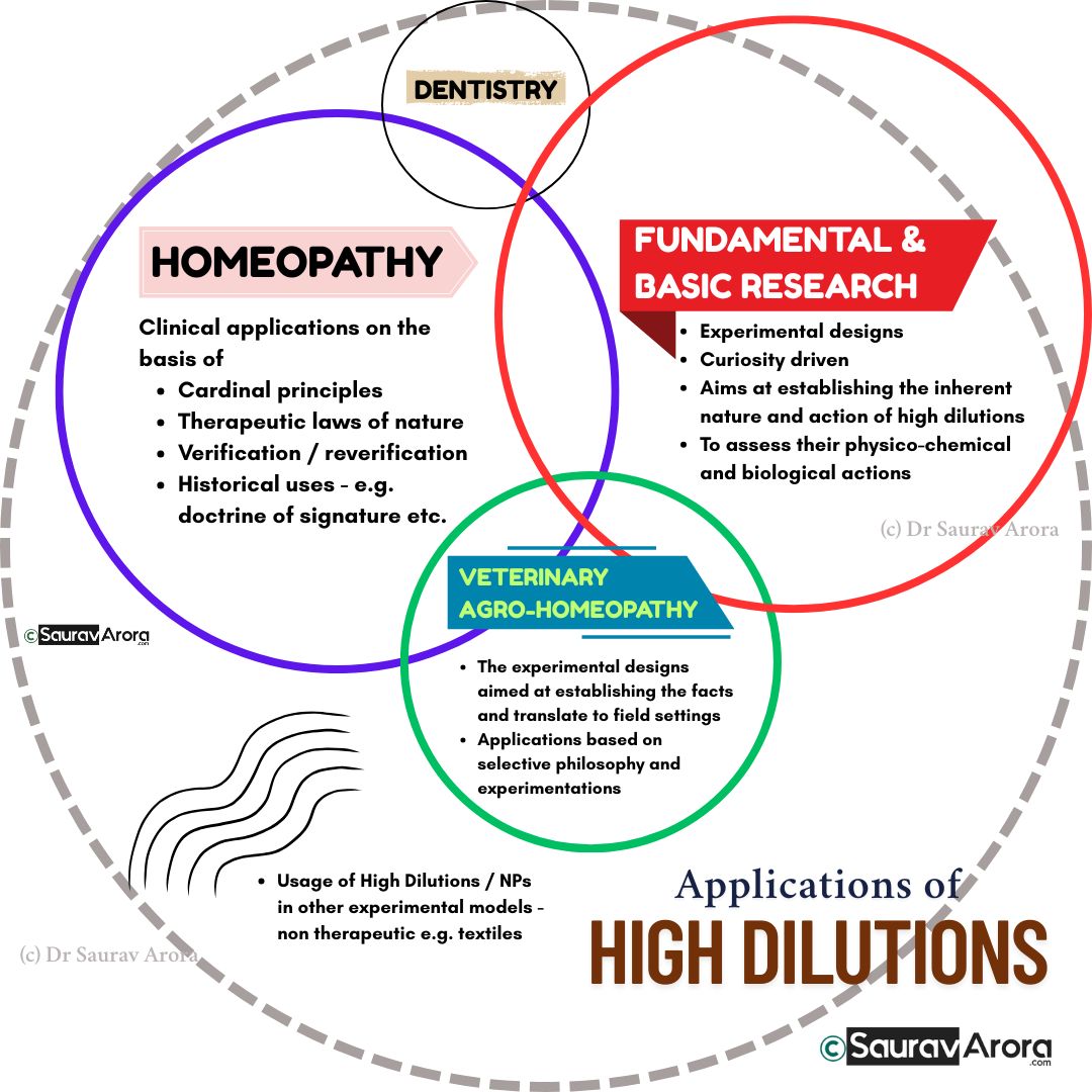 The vast and versatile field through can be represented through this visual that highlights the multidisciplinary relevance of high dilutions—from medicine and agriculture to material science and nanotechnology.